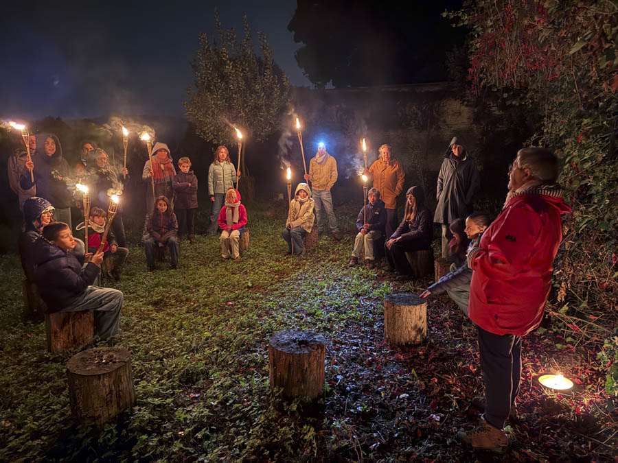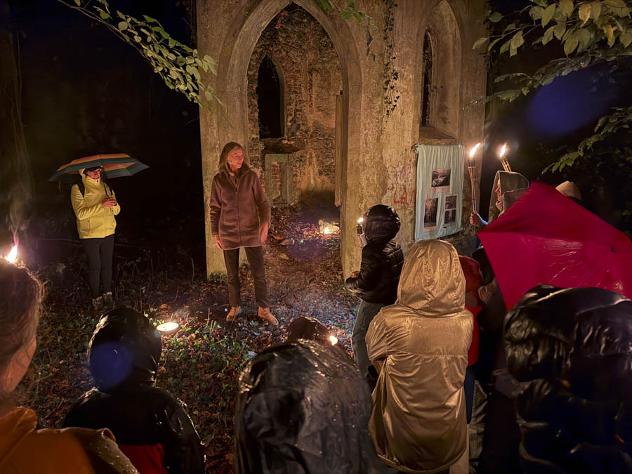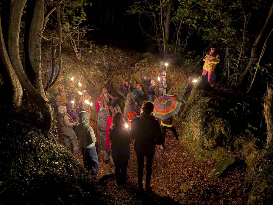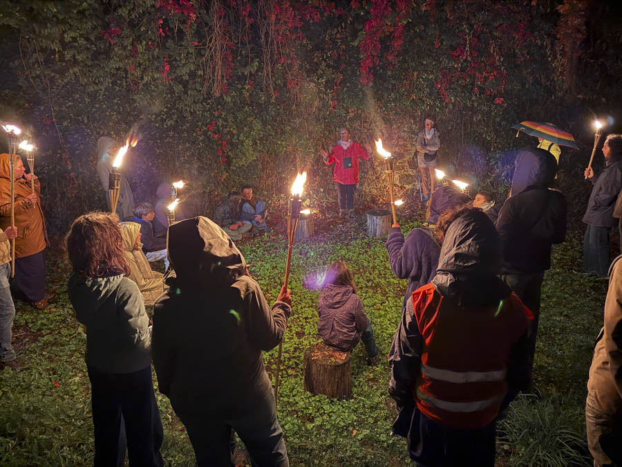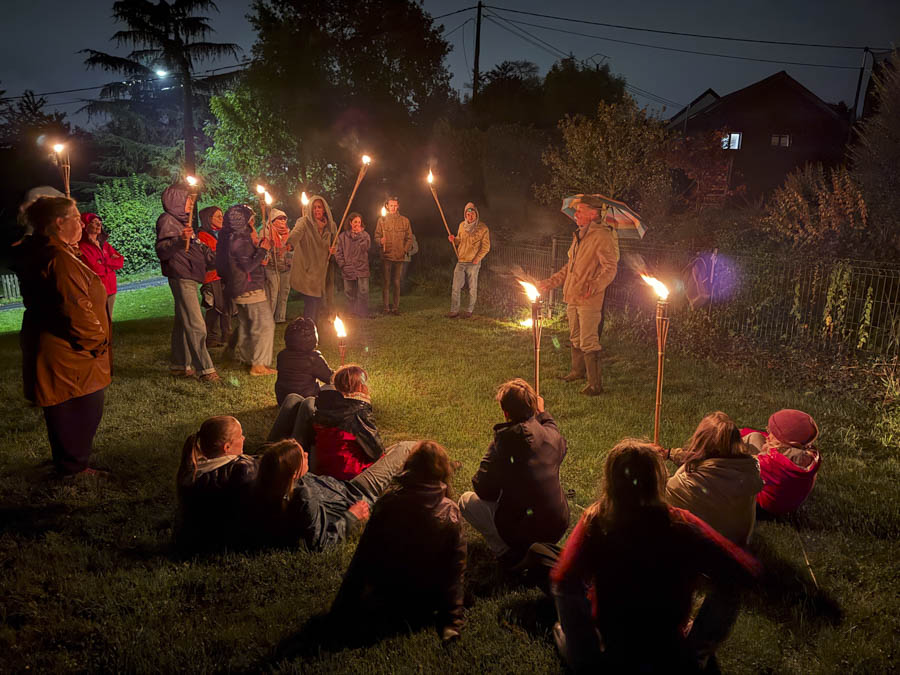 Les deux groupes de la promenade contée ont ainsi escaladé les sentiers escarpés et rocailleux du bois dont les passages les plus délicats avaient été au préalable sécurisés. Les sites choisis pour les arrêts, en particulier la ruine de l’ancienne chapelle Saint-Joseph, avaient pris, avec les lueurs des torches et bougies et le bruit du vent d’automne dans les feuillages, un aspect impressionnant, déroutant, formant un décor magique pour les récits racontés avec talent par Julie Renson, Bernadette Mottoulle-Guyot, Philippe Tock et André Fraselle.